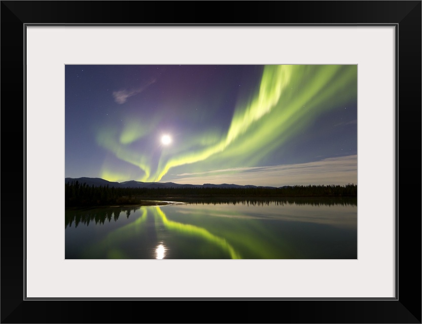 <p>Aurora borealis and Full Moon over the Yukon River, Whitehorse, Yukon, Canada.</p>