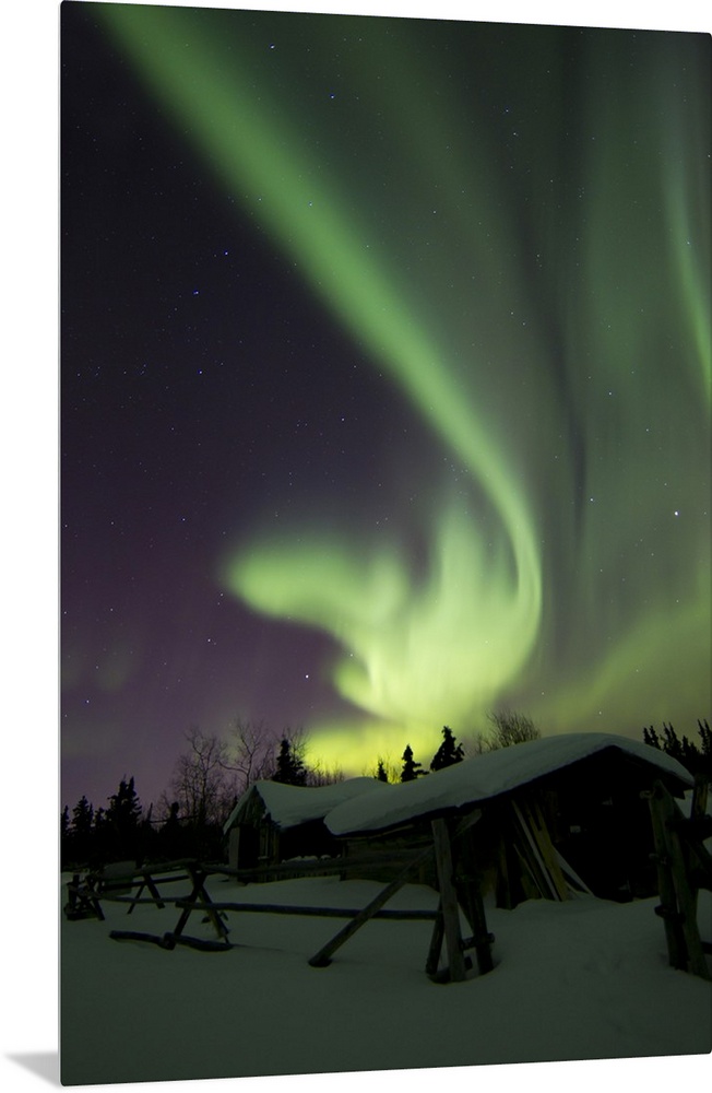 <p>Aurora borealis and the Big Dipper light up the sky above a log cabin at Whitehorse, Yukon, Canada.</p>