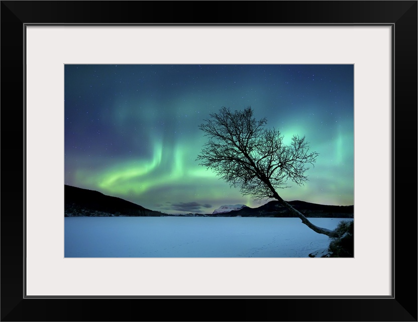 <p>Aurora Borealis over Sandvannet Lake in Troms County, Norway. Auroras are the result of the emissions of photons in the Earth's upper atmosphere.</p>