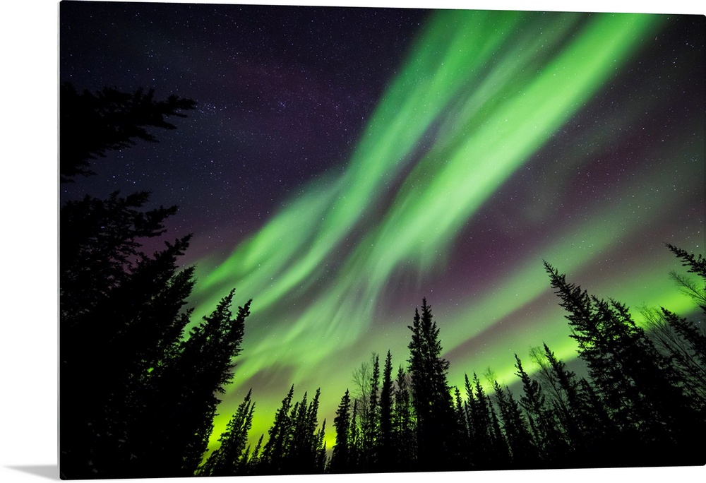 <p>Aurora borealis over silhouetted trees at the clearwater state recreation site in delta junction. Alaska, united states of America.</p>