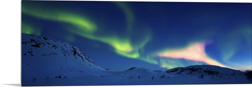 <p>Aurora Borealis over Skittendalen Valley, Troms County, Norway. Auroras are the result of the emissions of photons in the Earth's upper atmosphere.</p>