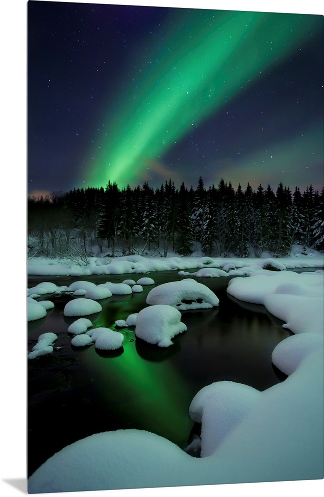 <p>Aurora Borealis over Tennevik River in Troms County, Norway. Auroras are the result of the emissions of photons in the Earth's upper atmosphere.</p>