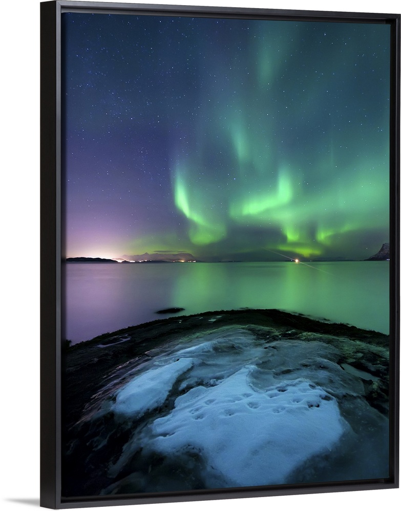 <p>Aurora Borealis over Vagsfjorden outside of Harstad in Northern Norway. Auroras are the result of the emissions of photons in the Earth's upper atmosphere.</p>