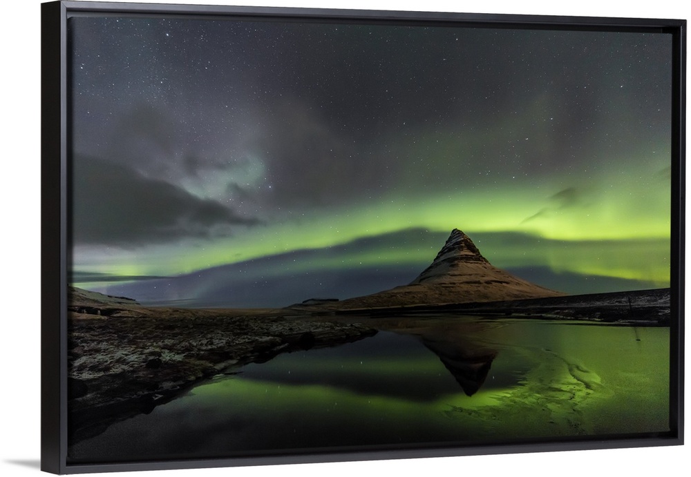 <p>Aurora borealis reflects below Kirkjufell aka Church Mountain on the Snaefellsnes Peninsula in western Iceland.</p>