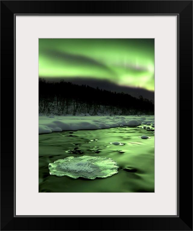 <p>Aurora Borealis reflects off the Tennevik River, Troms County, Norway. Auroras are the result of the emissions of photons in the Earth's upper atmosphere.</p>
