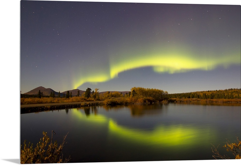 <p>Aurora borealis with moonlight at Fish Lake, Whitehorse, Yukon, Canada.</p>