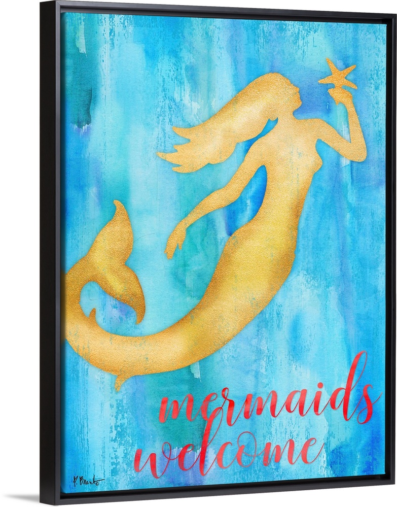 <p>Metallic gold silhouette of a mermaid holding a starfish on a blue watercolor background with "Mermaids Welcome" written at the bottom in red.</p>
