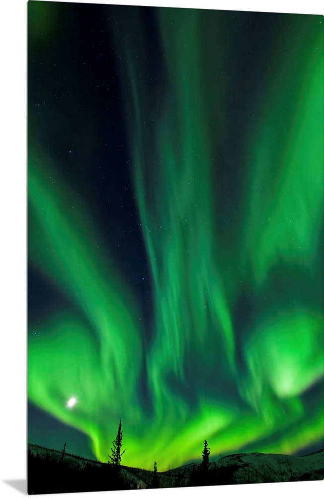 <p>The bright neon green aurora and moon dancing like a flame over the boreal forest, Chena River State Recreation Area, Fairbanks, winter.</p>