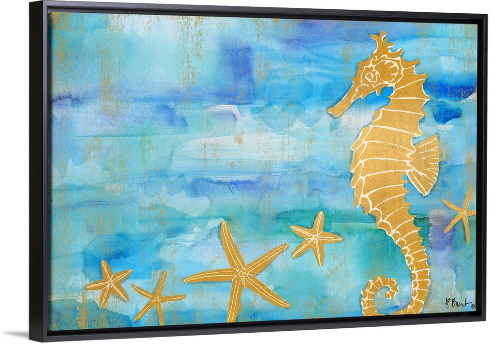 <p>Metallic gold seahorse and starfish on a blue and green watercolor background.</p>