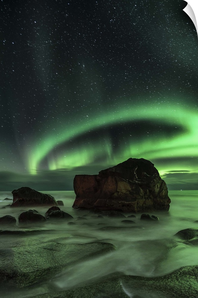<p>Ring-shaped aurora borealis over a boulder in the ocean, Norway.</p>