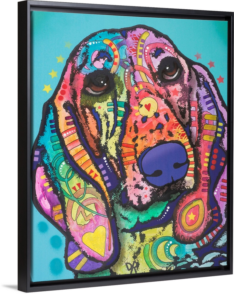 <p>Colorful artwork of a hound dog with graffiti-like designs on a light blue background.</p>