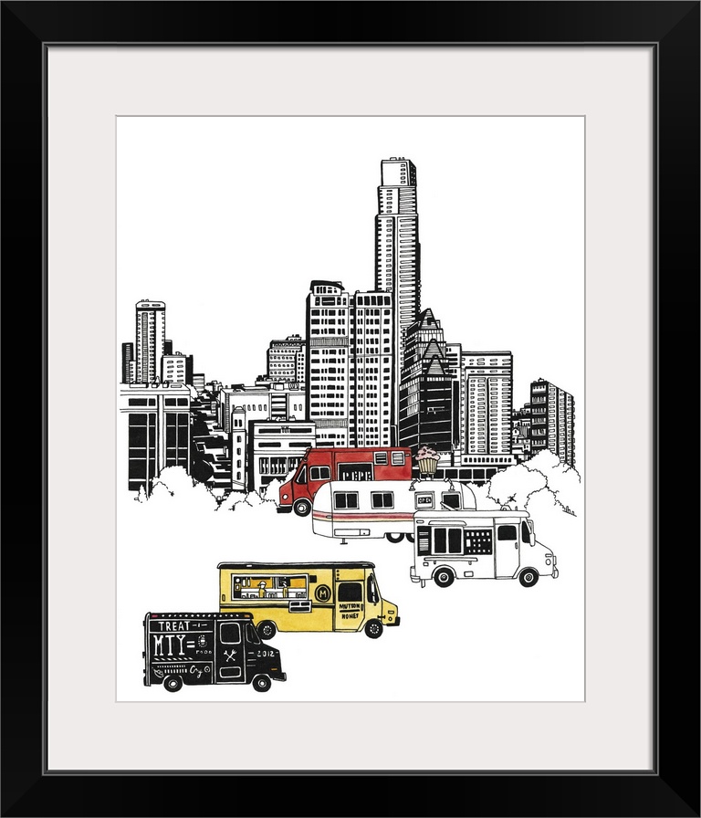 <p>Black and white watercolor painting of the Austin, TX skyline with colorful food trucks in the foreground.</p>