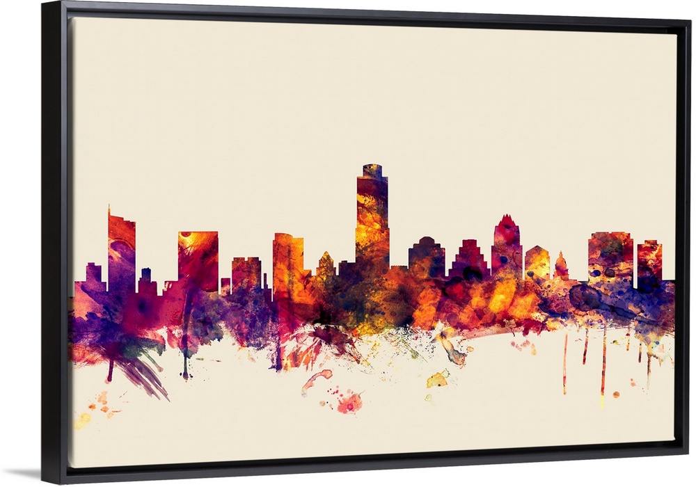<p>Contemporary artwork of the Austin city skyline in watercolor paint splashes.</p>