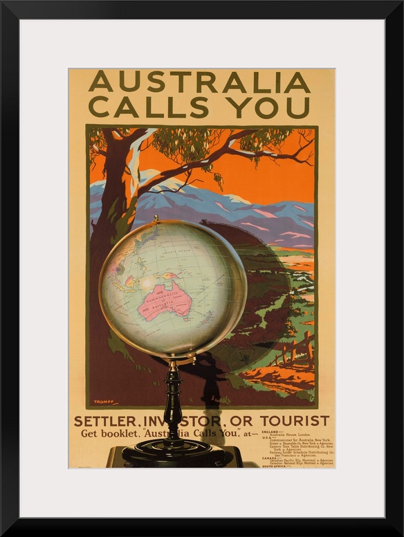 <p>A globe focused on Australia stands in front of a scenic landscape of Australia. Illustrated by Percy Trompf, ca 1920s</p>