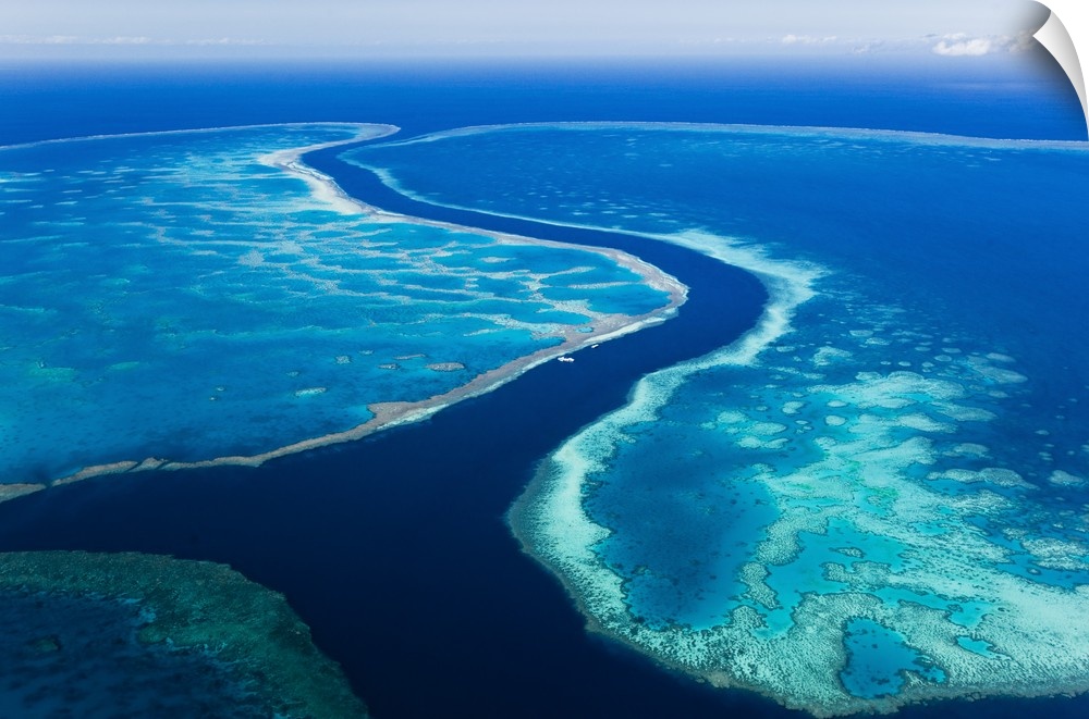 <p>Australia, Queensland, Whitsundays, Great Barrier Reef Marine Park. Aerial view of The River, a 200 ft deep channel running between Hardys Reef and Hook Reef.</p>