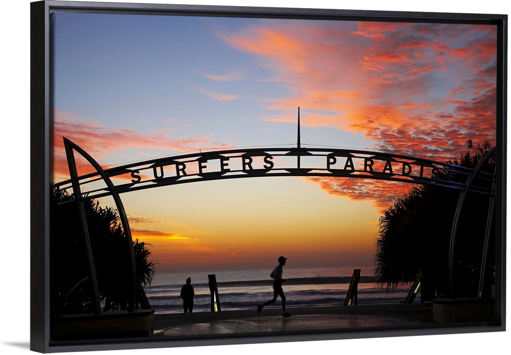 <p>Australia, Queensland, Gold Coast, Jogger and Sign at Sunrise, Surfers Paradise</p>