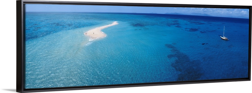 <p>Panoramic, aerial photograph of clear blue waters over the Great Barrier Reef, a single sailboat in the water, in Queensland, Australia.</p>