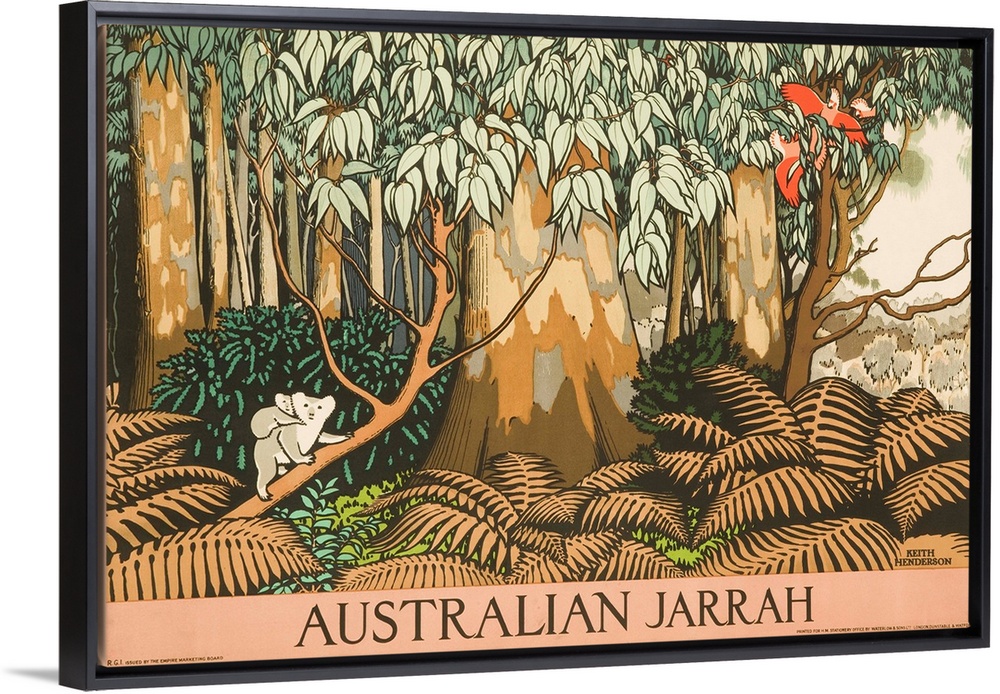 <p>Australian travel poster. Mother and baby Koala bears climb a jarrah / eucalyptus tree. ca 1930s illustrated by Keith Henderson</p>