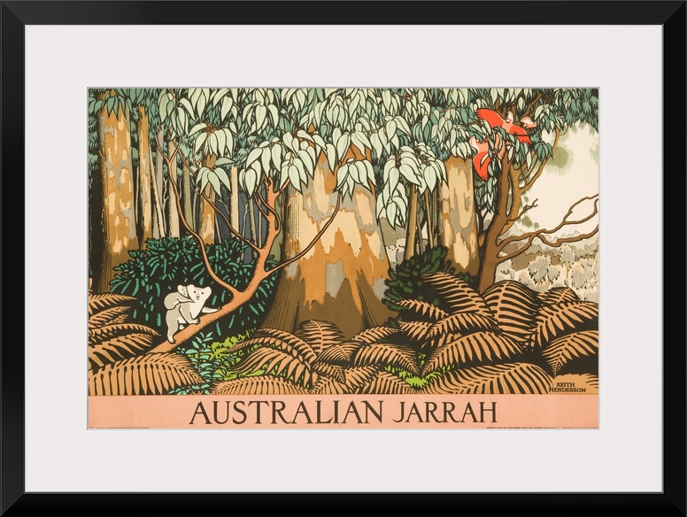 <p>Australian travel poster. Mother and baby Koala bears climb a jarrah / eucalyptus tree. ca 1930s illustrated by Keith Henderson</p>