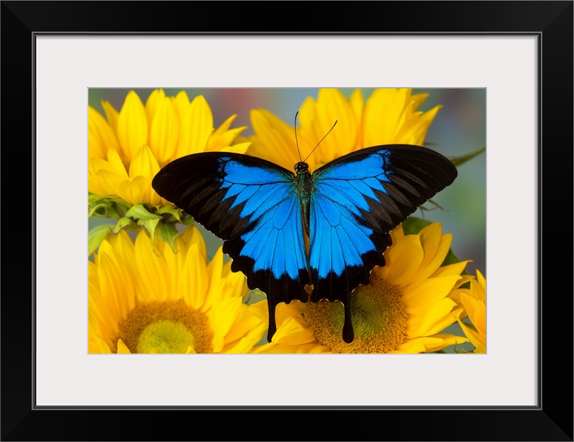 <p>Australian Mountain Blue Swallowtail Butterfly, Papilio ulysses, on sunflower.</p>