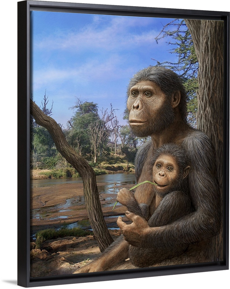 <p>Australopithecus afarensis. Artwork of a female Australopithecus afarensis hominid with her child. This hominid lived between 3.9 and 2.9 million years ago. Fossil specimens have only be found in eastern Africa. It is thought that A. afarensis may have given rise to several lineages of early human. Compared to the modern human skull A. afarensis had a forward protruding (prognathic) face and held a smaller brain.</p>