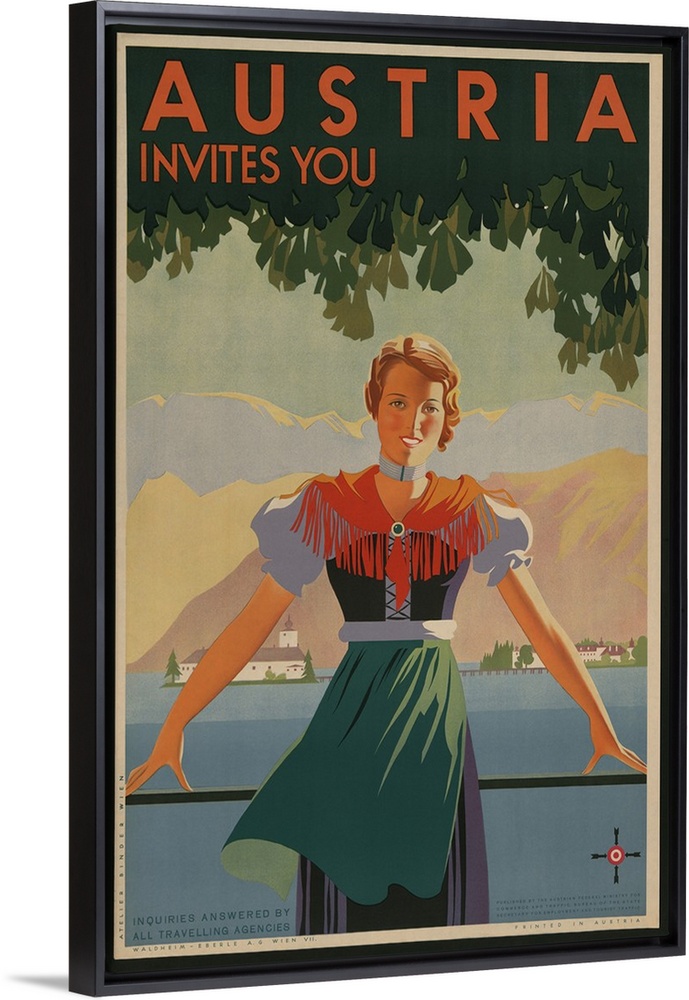 <p>Austria Invites You! 1934 travel poster shows young woman in front of stylized village and mountains.</p>