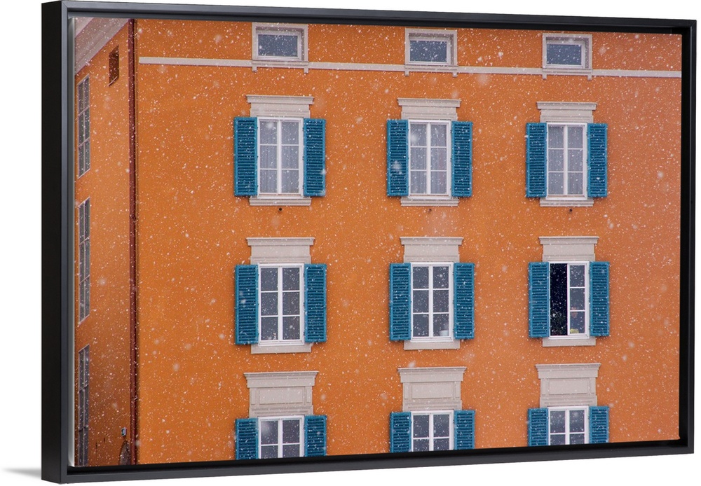 <p>Europe, Austria, Salzburg. Blue shutters on orange apartment building in snowfall. (UNESCO World Heritage Site) Credit as: Bill Young / Jaynes Gallery / Danita Delimont.com .</p>