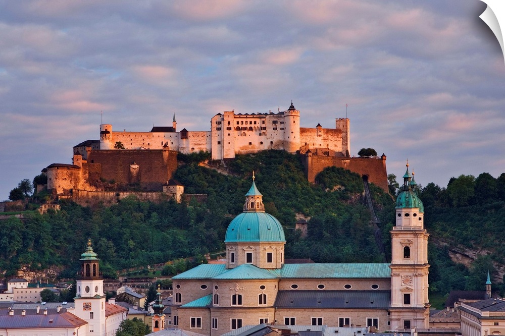 <p>Veduta del Festung Hohensalzburg, il castello dei Principi Arcivescovi di Salisburgo, con il Duomo, nel centro storico di Salisburgo.</p>