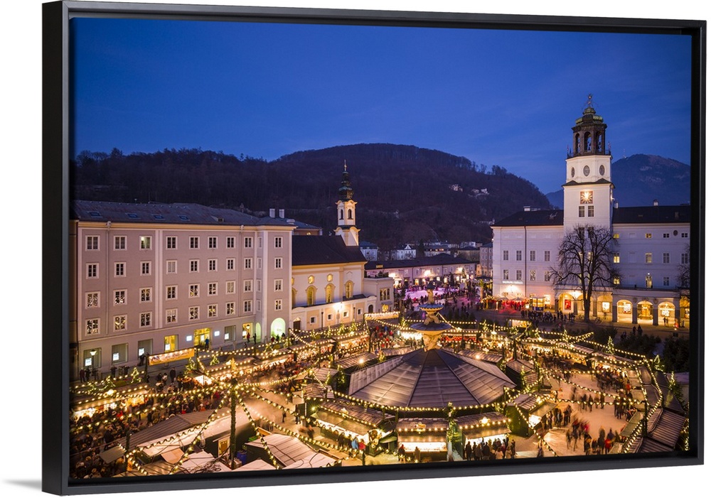 <p>Austria, Salzburgerland, Salzburg, Christmas Market, Residenzplatz, elevated view, dusk</p>