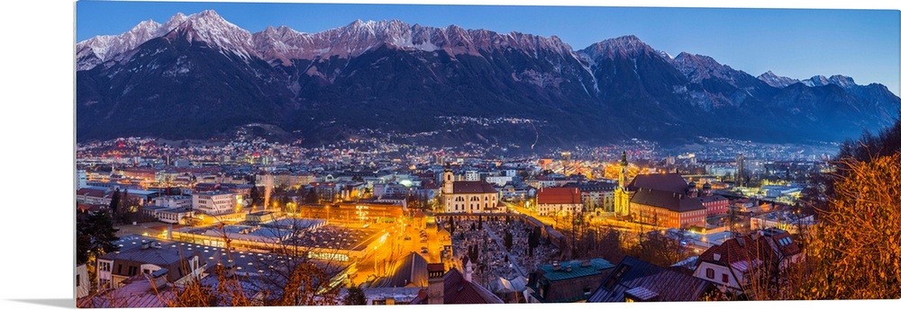 <p>Austria, Tyrol, Innsbruck, elevated city view with the Wilten Basilica and Wilten Abbey Church, dawn, winter</p>