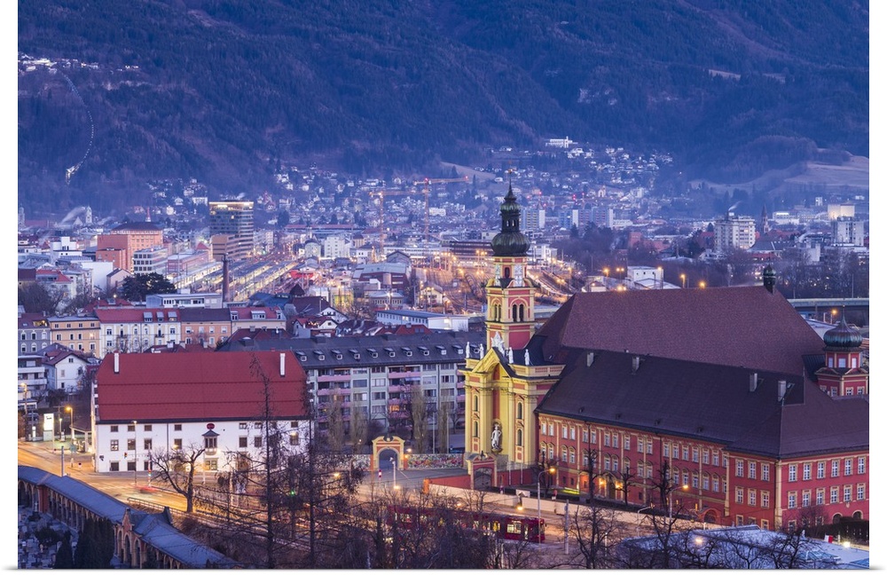 <p>Austria, Tyrol, Innsbruck, elevated view of the Wilten Abbey Church, dawn, winter</p>