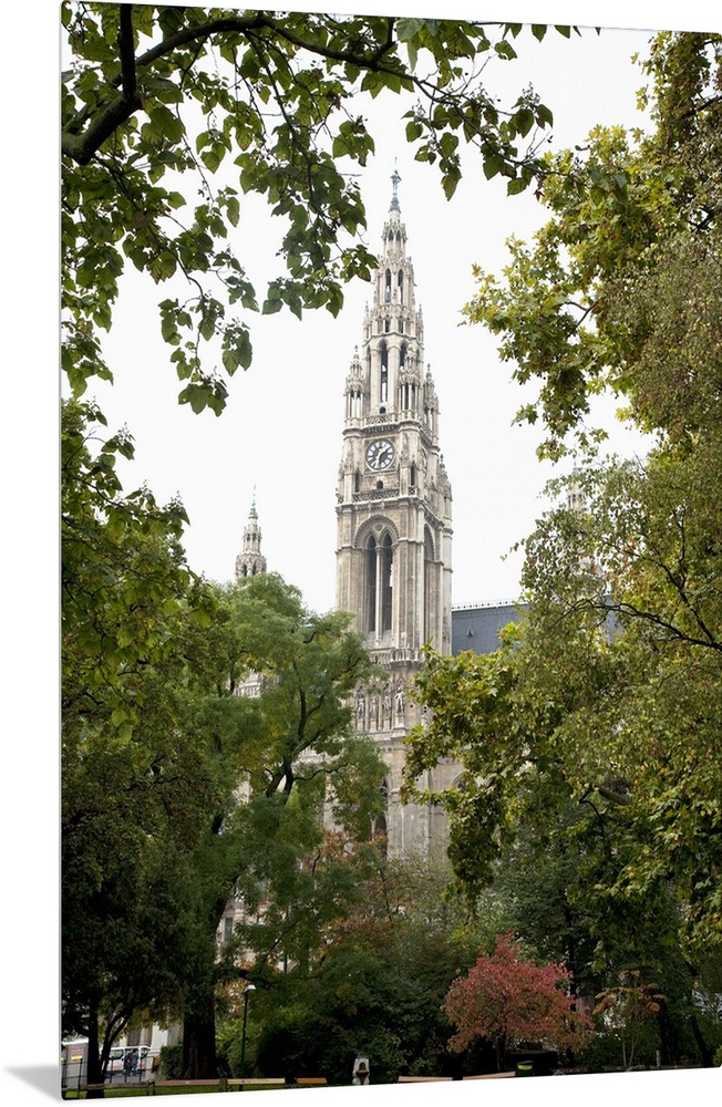 <p>Vienna, Austria - Low angle view of an ornate, old world church. Trees are framing the building in the foreground. Vertical shot.</p>