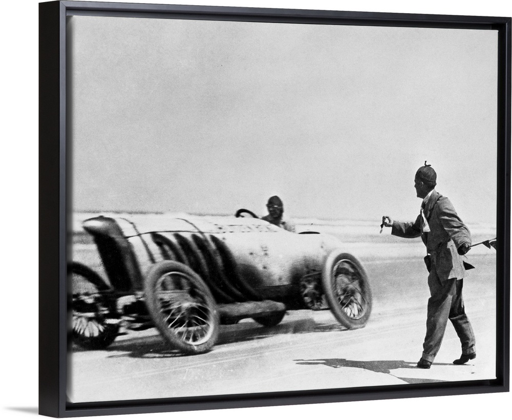 <p>American automobile racer Barney Oldfield setting a record speed of 131.7 miles-per-hour in his Blitzen Benz, at Daytona Beach, Florida, 1910.</p>