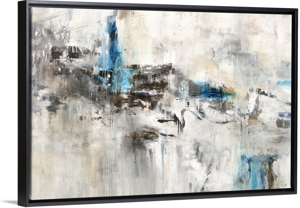 <p>Large abstract painting with neutral colors and pops of bright blue throughout.</p>