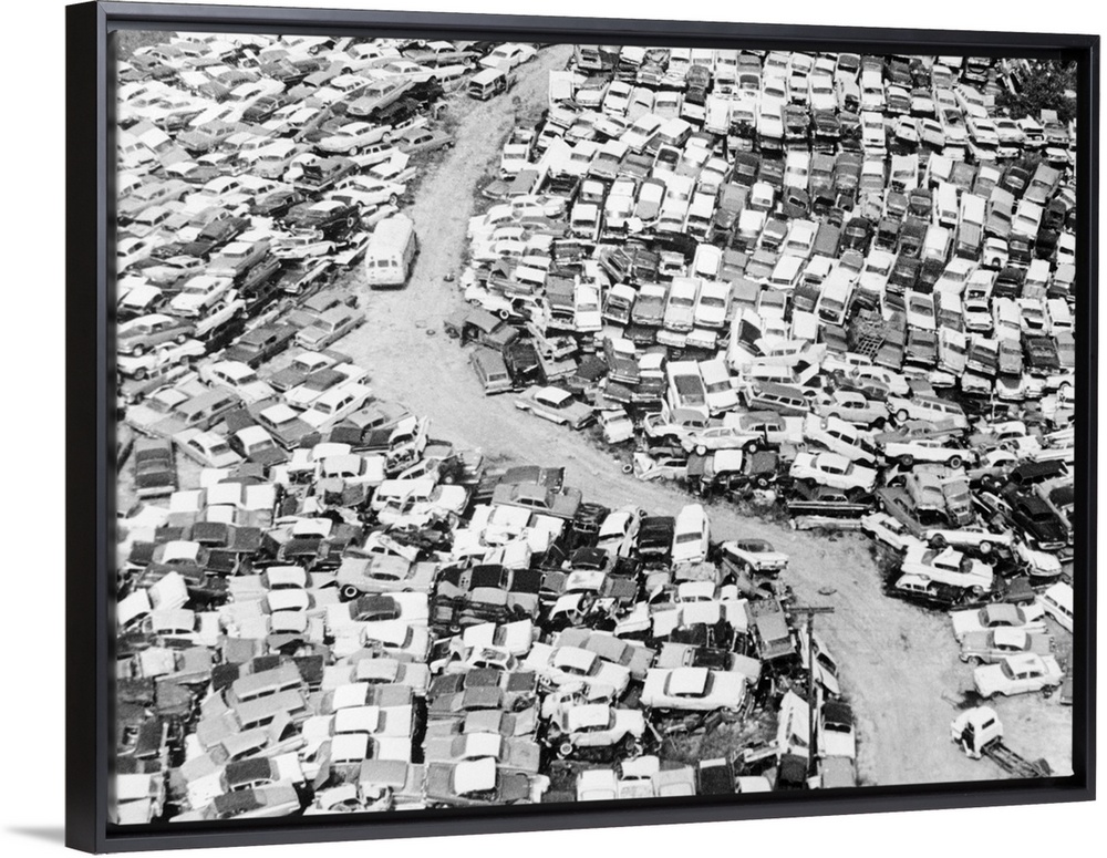<p>Auto Graveyard. Detroit, Michigan: Besides being the birthplace of automobiles, Detroit also has one of the largest auto graveyards in the nation. Thousands of cars spread over 25 acres of land wait to be reduced to a mere block of fragments. About 1,00o cars a day are loaded into a 6,000-horsepower fragmentizer, which reduces the autos to scraps of reclaimed steel for the Ford Motor Company's iron and specialty foundries.</p>