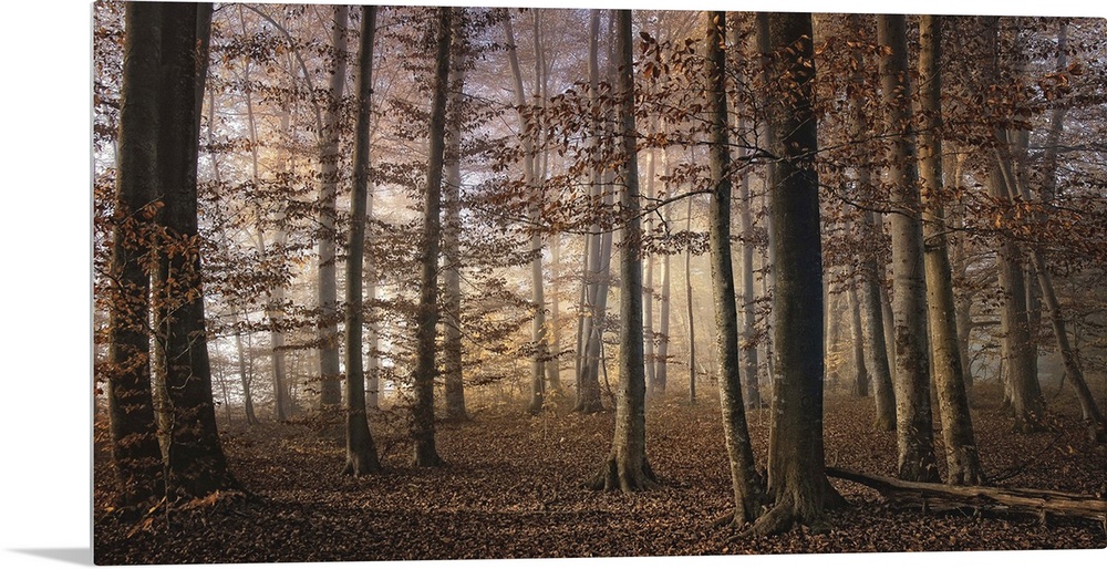 <p>Forest in the fall with trees and the ground full of orange leaves.</p>