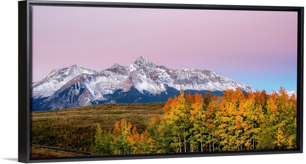 <p>Landscape photograph of a snowy mountain range with colorful Fall trees in the foreground and a cotton candy sky above.</p>