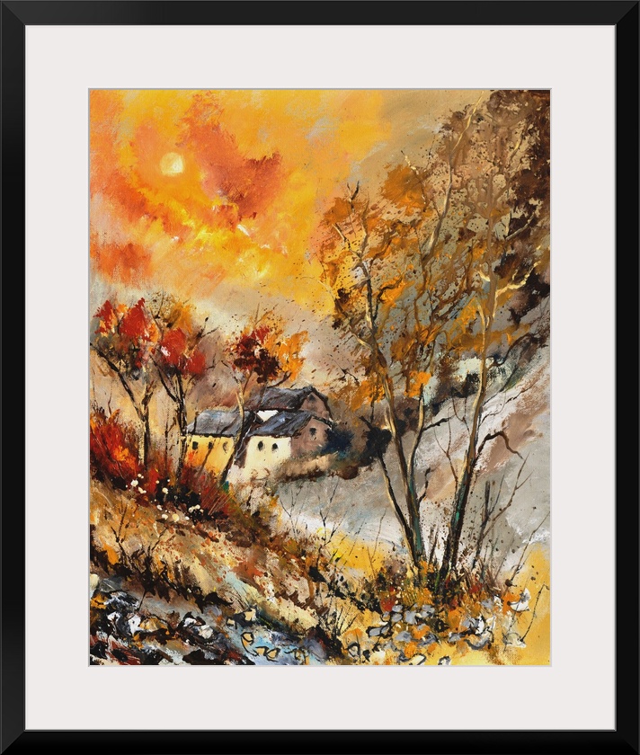 <p>Vertical painting of bare trees in a field of golden grass with a vibrant golden sky on an autumn day.</p>