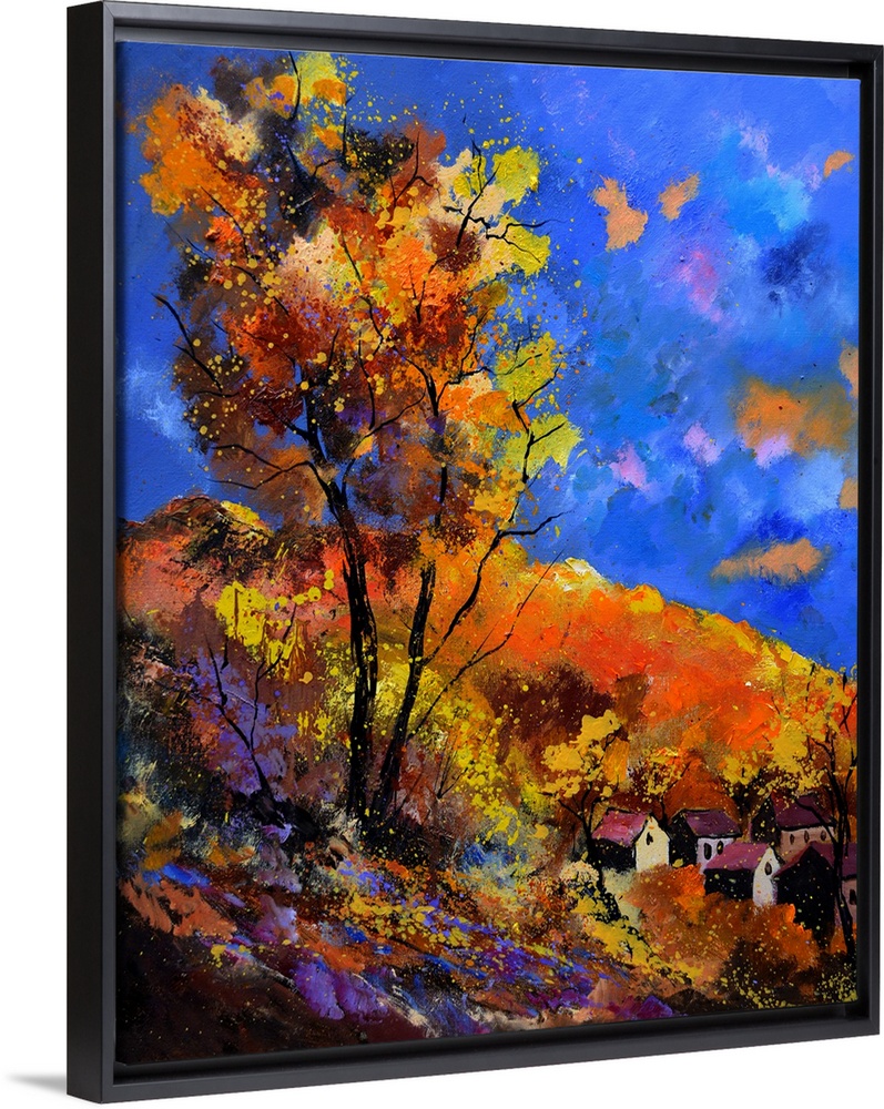 <p>Vibrant painting of an autumn day with blossoming trees, a colorful sky, and a village in the distance.</p>