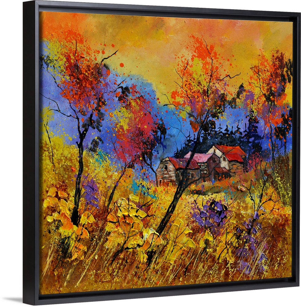 <p>Vibrant painting of a fall day with golden trees, a colorful sky, and a house in the distance.</p>