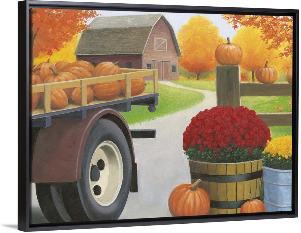 <p>Decorative Fall painting of a farm with a trailer full of pumpkins, potted mums, and a red barn in the background.</p>