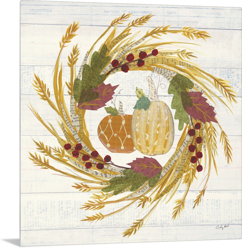 <p>Decorative artwork of a wreath of fall leaves with pumpkins and a white wood background.</p>