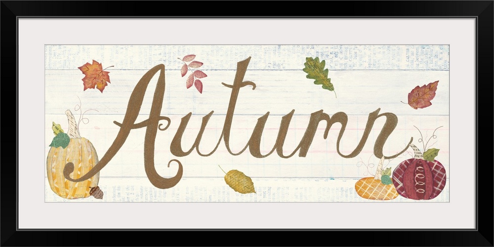 <p>Decorative artwork of the word "Autumn" with fall leaves and pumpkins and a white wood background.</p>