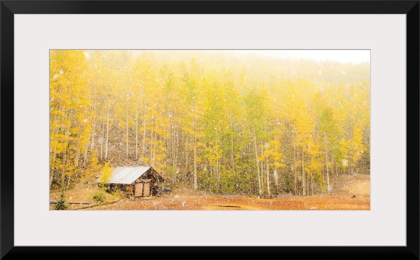 <p>Landscape photograph of yellow and green Autumn trees with a small cabin during snowfall.</p>