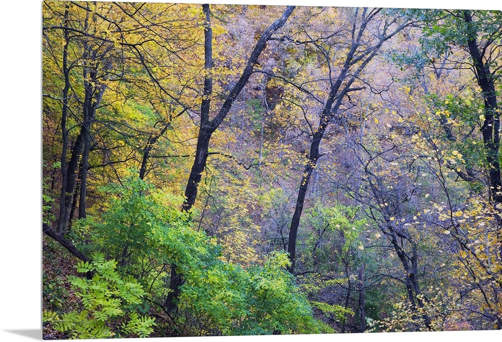 <p>Photograph taken through dense brush during the fall season as the leaves have begun to change colors.</p>