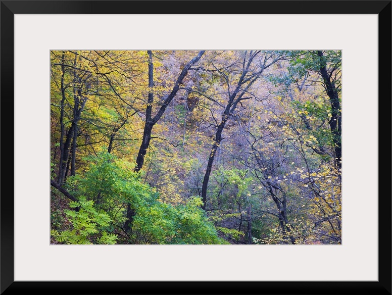 <p>Photograph taken through dense brush during the fall season as the leaves have begun to change colors.</p>