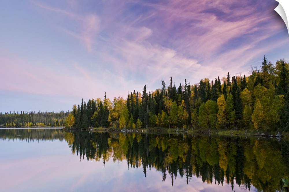 <p>Autumn coloured foliage on the trees surrounding Dickens Lake at sunset; Saskatchewan, Canada</p>