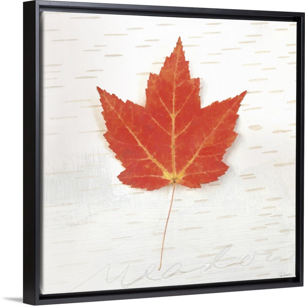 <p>Square art with a red Fall maple leaf on an aspen wood grain background with "meadow" faintly written at the bottom.</p>