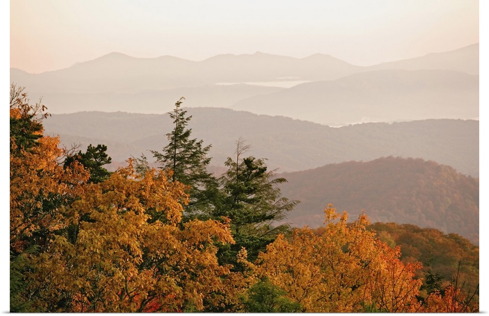 <p>Autumn colors in the southern Appalachian Mountains at sunrise, from Blue Ridge Parkway, Pisgah National Forest, North Carolina</p>