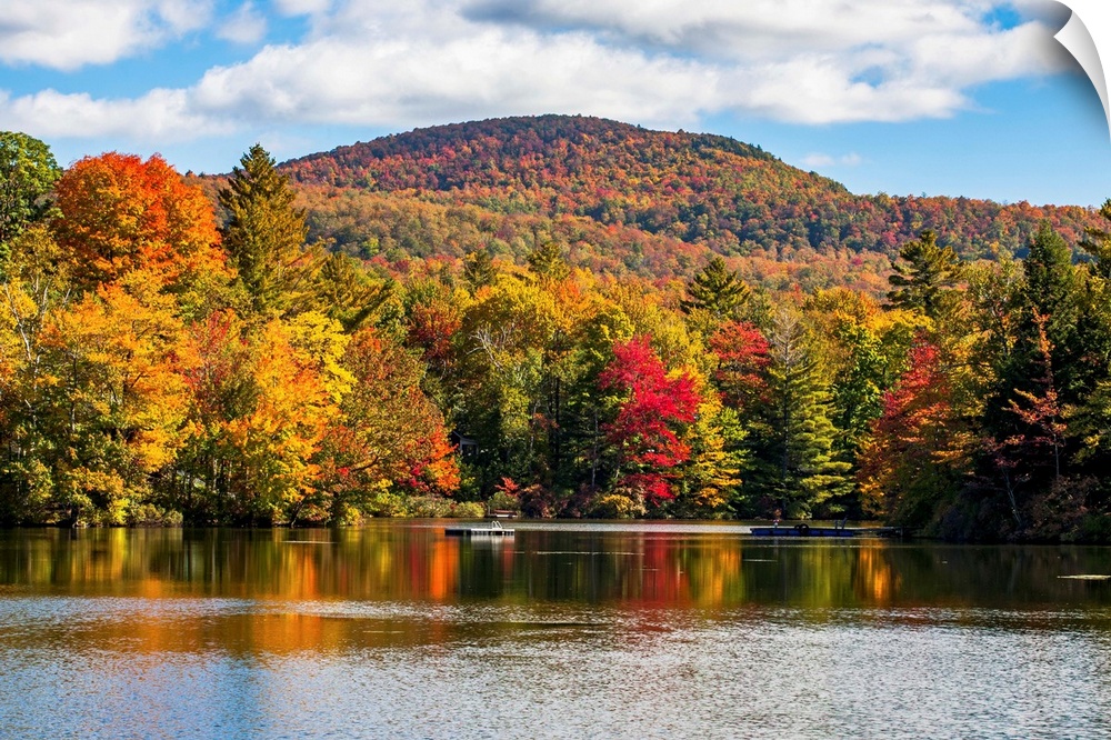 <p>Autumn coloured trees in a forest around a small lake, Sally's Pond, Quebec, Canada.</p>